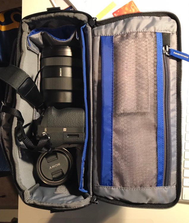 Sony was disappointing overall in this respect, except for their hard working, very friendly sales guys and girls. I ordered a small bag from their online shop, thinking I would give the manufacturer a try, only to cancel my order after they said it would be three months for delivery. The Sony guys deserve respect in giving it a full try searching their store exhaustively everytime I asked them. I needed something that would hold the camera securely, without wobbling it when carried, and gives me some space for a spare lens, I currently have two. So here it is, a Mirrorless mover 25i by Thinktank Photo: